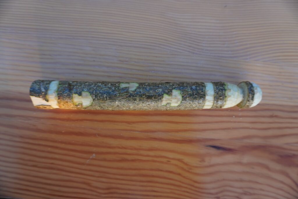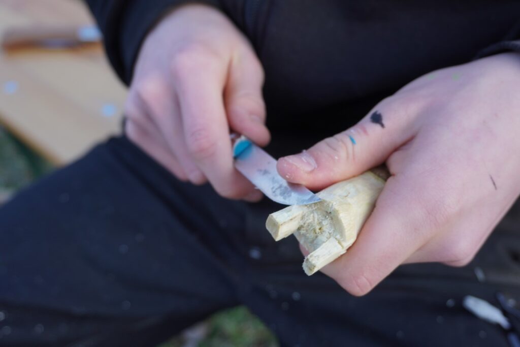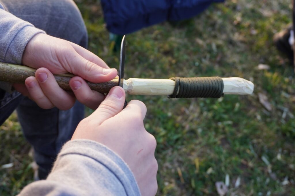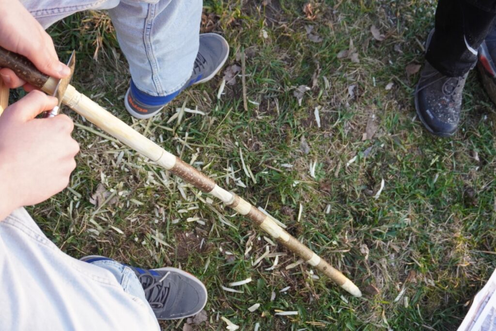 Jeder der Teilnehmenden darf selbst seinen Wanderstock dekorieren. Dabei kann die Rinde in verschiedenen Mustern abgeschnitzt und eingeritzt werden.